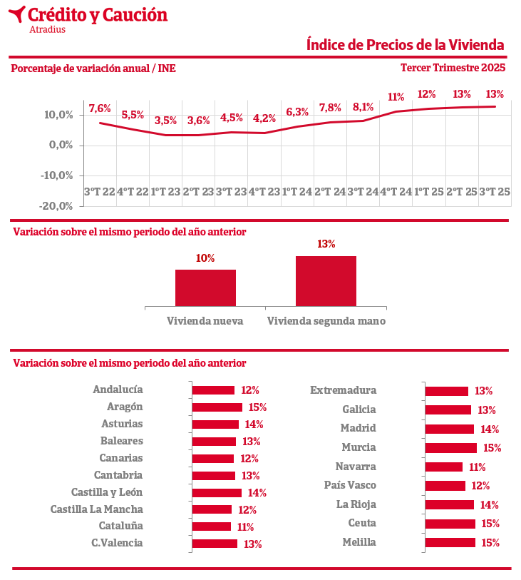 Según el INE, en el tercer trimestre de 2025, el Índice de Precios de Vivienda aumenta un 13%. La vivienda de segunda mano crece un 13% y la nueva, un 10%.
